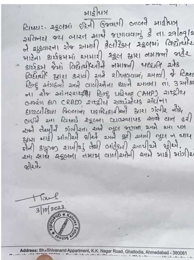 मिली जानकारी के मुताबिक, 29 सितंबर को कैलोरेक्स फ्यूचर स्कूल में छात्रों के लिए एक सार्वजनिक कार्यक्रम आयोजित किया गया था. इस कार्यक्रम में एक छात्र से नमाज की पूरी प्रक्रिया कराई गई और अन्य छात्रों को पढ़ाया गया. यह माफीनामा सोशल मीडिया पर भी वायरल हो गया है।